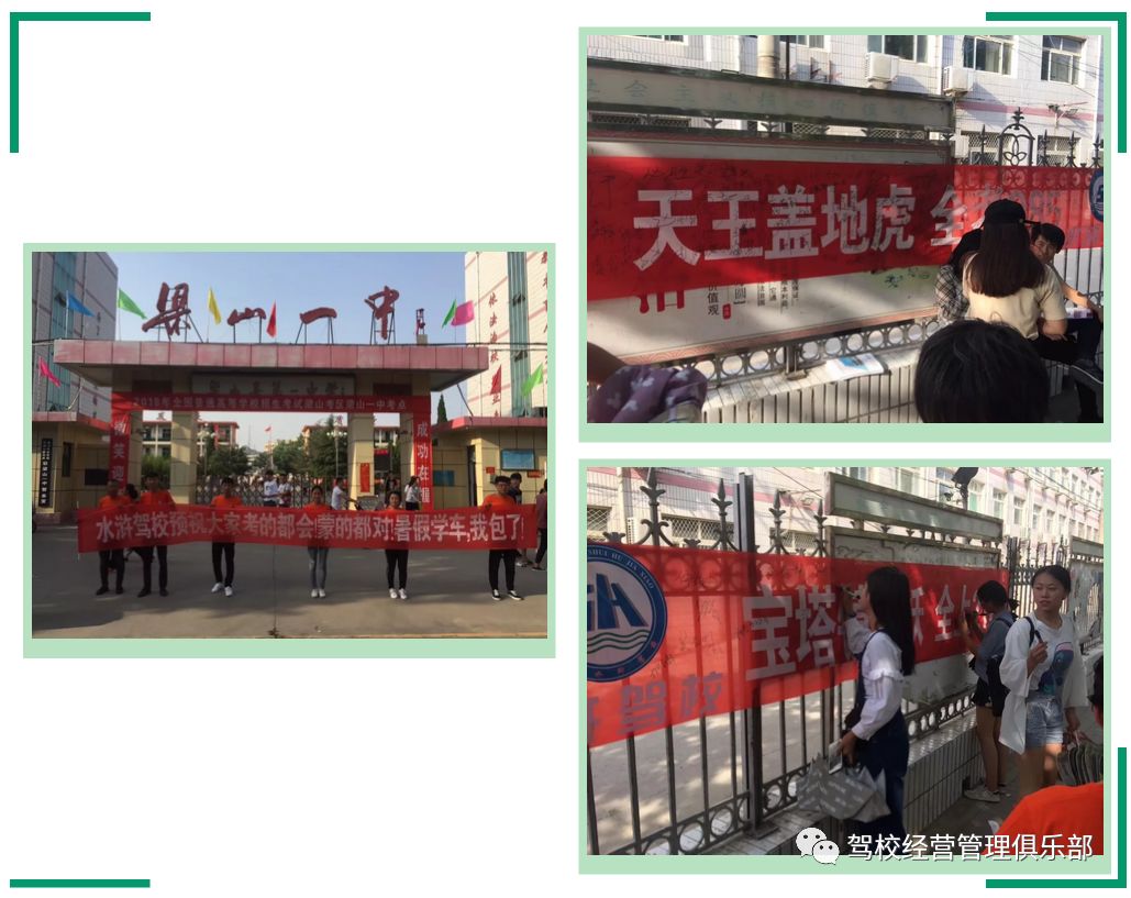 高考越来越被驾校所重视,每到这个时候,各个驾校都在盯着这份“大蛋糕”,都想着多分一份“羹”。各驾校纷纷做起爱心送考、爱心服务站及一系列服务,首次以分享者的身份,将我们水浒驾校近年高考一系列高考营销流程及细节分享给大家。